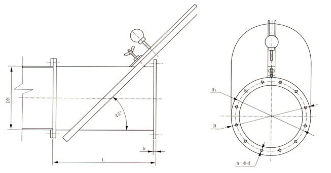 在垂直管道(氣流向上)上插板以45度逆氣安裝。其公稱(chēng)直徑指管道外徑值。